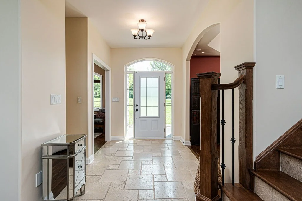 There is a sweeping staircase off to your left, and a granite-topped kitchen. The feeling, so solid underfoot in this slab-on-grade home, is of having entered some grand chateau. One almost expects the Alps to rise up beyond the trees.