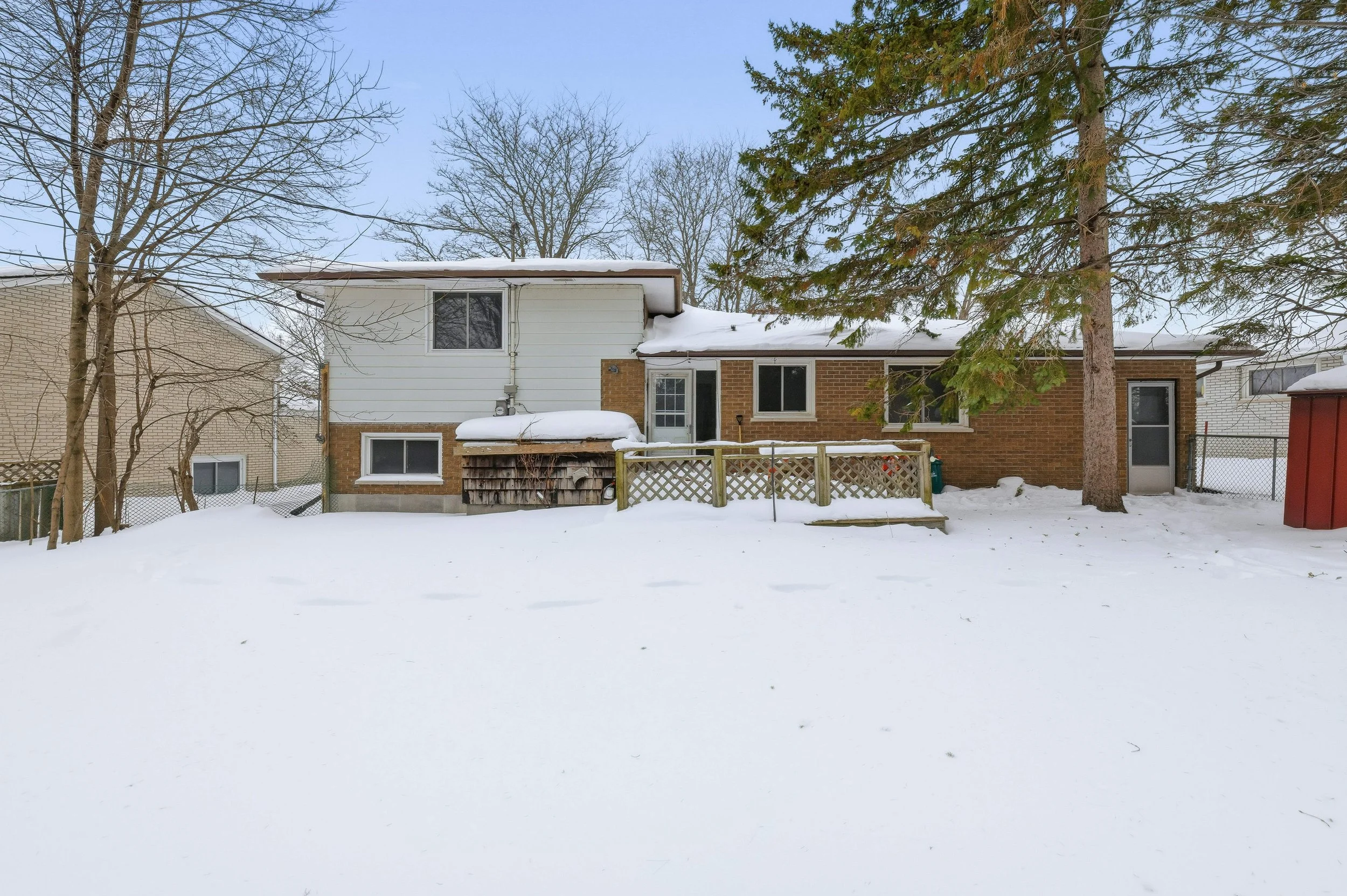 A four-bedroom Bayridge side-split with attached garage, deck, a truly majestic pine tree, and green shag pile carpet.